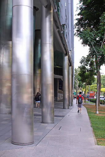Finally, we turn left to Victoria St, using the pavement beside SMU admin block. Our destination, the National Library, is within our sight. The pavement was in the light, shaded by the massive building of SMU. In fact, its sidewalk bordered by huge metal pillars was dank, uninviting and dark. Victoria St at the right of the pavement was alive, blitzed by cars rushing about their business. 5 feet of safety on slates of grey, straddles between light and darkness.